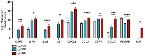 Severe COVID-19 cases, particularly those involving CS, are characterized by heightened levels of proinflammatory cytokines, which are critical predictors of disease severity and mortality []. We analyzed our A549 cell RNA sequencing data to investigate the expression of 24 cytokines commonly elevated in severe COVID-19, with a particular focus on their expression in epithelial cells and the influence of hypoxia. This panel of cytokines was selected based on multiple studies that analyzed serum cytokine levels in mild, severe or fatal COVID-19 cases, demonstrating elevated levels in more severely affected patients [,,,,]. Our findings revealed that 10 out of the 24 cytokines, namely CSF3, IL1A, IL1B, IL6, CXCL8, CCL2, CSF1, CCL20, PDGFB, and TNF, were expressed at the RNA level by A549 lung epithelial cells. Eight of these ten cytokines were significantly upregulated in the HOC43 condition, compared to NOC43 (Figure 5). All genes were identified as synergistically expressed, apart from CSF1 and PDGFB. This suggests that hypoxia may play a critical role in exacerbating the inflammatory response associated with COVID-19, potentially intensifying CS observed in severe cases. PDGFB gene expression was also significantly elevated in the HAlone condition compared to NOC43 [].