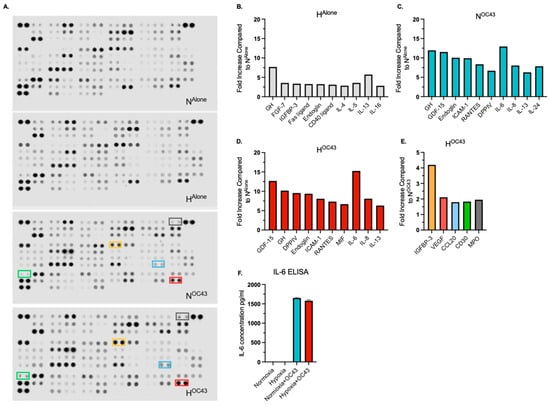 Secreted/released cytokine, chemokine and immune-related protein expression in A549 lung epithelial cells infected with HCoV-OC43 under normoxic and hypoxic conditions. Protein levels were assessed using cytokine, chemokine and immune-related antibody arrays, analyzing pooled cell culture supernatant samples from the RNA sequencing experiments (n = 4 independent biological repeats). (A) shows the antibody arrays used to evaluate protein expression across the four experimental conditions. (B–D) display the top 10 upregulated protein in each condition, normalized to NAlone. (E) highlights the expression of the five proteins—IGFBP-3, VEGF, CCL20, CD30 and MPO—that were upregulated by more than 1.5-fold in the HOC43 condition compared to the NOC43 condition. The color of the bars corresponds to the color-coded boxes on the antibody arrays. (F) IL-6 ELISA assay on pooled supernatant samples (n = 4).
