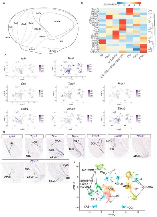Clusters were annotated based on the expression of well-established marker genes for cell type [13,14,31,32,33]: astroglia (Fgfr3, Aqp4, Agt, Gfap, Htra1); immature and mature oligodendroglia (Cspg4, Pdgfra, Mog, Opalin, Mobp); and neurons (Snap25), either excitatory Slc17a6, Slc17a7) or inhibitory (Gad1, Gad2) (Figure 1d). For cluster annotation of cell areas, we used the “FindAllMarkers” function (Wilcoxon Rank sum test by default) from Seurat-5.1.0 and the AGEA tool from AMBA (https://mouse.brain-map.org/agea (accessed on 24 June 2025)). Cell areas identified were: piriform cortex (Pir; Nwd2, Igfn1, Trps1, Adcy8, and Cux2); the lateral entorhinal area (ERhL; Cdh20, Trps1, Adcy8, Pde11a, Cux2, Nwd2, Nr4a2, Satb2); medial entorhinal cortex, pre/para-subiculum, subiculum, and CA1 field (ERhM/Pre-/Para-/Sub/CA1; Dcn, Trpc4, Grp161, Pde11a, Tox, Cdh20, Adcy8, Cux2, Nr4a2, and Satb2); CA3 field (CA3; Tle4, Trpc4, Gpr161, Zfpm2, and Trps1); dentate gyrus (DG; Prox1, Trpc6 and Zfpm2); and pallial amygdala (APall; Baiap3, Nova1, Zfpm2, Tox, and Rorb). We constructed different heatmaps using the Shiny Cell package (normalized gene expression was average, log-transformed, and visualized in a plot: [34]. We visualized expression of the marker genes for cell type grouped by Seurat clusters (Figure 1d) and marker genes for cell area grouped by glutamatergic areas; genes were hierarchically clustered in these graphics.