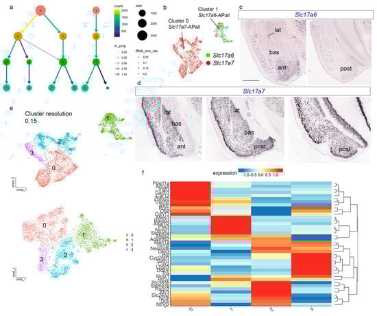 The data from the previous section showed the existence of two main pallial amygdalar clusters, identified as clusters 1 and 2 in Figure 1b, and as APall in Figure 2e. Next, we subclustered these two components out of the main Seurat object and removed GABAergic populations (Figure S4a,b). We obtained 4717 high-quality amygdalar pallial nuclei. To select a cluster resolution, we evaluated four potential resolutions: 0.05, 0.1, 0.15, and 0.2 (Clustree in Figure 3a). At the lowest value (0.05), we detected only the two main clusters mentioned above (named now 0 and 1; Figure 3a,b and Figure S4c). Cluster 0 was enriched in Slc17a7 (Slc17a7-APall) transcripts, while cluster 1 was enriched in Slc17a6 (Slc17a6-APall; Figure 3b). We checked the expression pattern of Slc17a6 and Slc17a7 genes in the pallial amygdala and identified Slc17a6-APall selectively at the anterior domain of the radial amygdalar model (Figure 3c), whereas the Slc17a7-APall subdivision was represented by the lateral, basal and posterior radial domains (ant, lat, bas, post; Figure 3d; in situ hybridization from AMBA) [22,27]. At cluster resolution 0.1, cluster 0 resulted subdivided into two new clusters, 0 and 1, and the former cluster 1 was renamed cluster 2 (UMAP plot in S4c). At cluster resolution 0.15, we observed four main clusters: the former cluster enriched in Slc17a6-APall was now cluster 1, while the former Slc17a7-APall cluster was subdivided now into clusters 0, 2, and 3 (UMAP and tSNE plots in Figure 3e). The four adult samples and both sexes were represented in the four clusters at resolution 0.15 (Figure S4d,e).