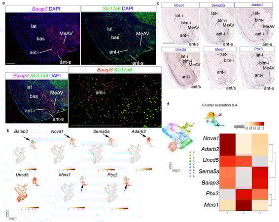 Transcriptomic data of the amygdalar anterior radial domain. (a) Multiplexed fluorescent in situ hybridization assay for Baiap3 and Slc17a6 in the amygdalar anterior radial domain. Combinations: Baipa3-DAPI, Slc17a6-DAPI, Baiap3-Slc17a6-DAPI, and Baiap3-Slc17a6 magnification of ant-i area. Coronal plane. Scale bars 500 µm. (b) UMAP plots showing the expression of anterior radial markers: Baiap3, Nova1, Sema5a, Adarb2, Uncd5, Meis1, and Pbx3. (c) In situ hybridization for Nova1, Sema5a, Adarb2, Unc5d, Meis1, and Pbx3 downloaded from AMBA. Scale bar 1200 µm. (d) UMAP plots of amygdalar dataset at resolution 0.4 colored by clusters (left) and heatmap gene markers for anterior radial domain at resolution 0.4, with hierarchical clustering of gene expression (right). ant-i, anterior radial domain, intermediate stratum; ant-s, anterior radial domain, superficial stratum; blm-i, basomedio-medial radial subdomain, intermediate stratum; lat-i, lateral radial domain, intermediate stratum.
