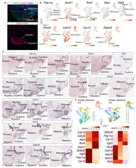 At resolution 0.15, the Slc17a7-APall cluster results subdivided into three main clusters (0, 2, and 3) expressing differentially a number of amygdalar gene markers (Figure 3e,f). Cluster 0 showed high expression of Dach1, Pde11a, Adcy8, Car12, Reln, Zbtb20, Vgll3, Cdh13, and Rorb. The combinatorial expression of these genes identified at cluster resolution 0.15 indicates that cluster 0 corresponds to the posterior radial domain (Figure 5) [22]. The periventricular stratum of this radial domain (post-p) corresponds to the amygdalo-hippocampal area (AHi) [21], while the intermediate and superficial strata (post-i, post-s) jointly compose the posteromedial cortical nucleus (PMCo) [21]. In addition, Garcia-Calero et al. [22] described three radial subdomains in this region: rostrolateral (RLpost), rostromedial (RMpost), and caudolateral (CLpost), which we tried to distinguish in our material. Pde11a, Dach1, and Rorb showed differential expression patterns in our in situ preparations, UMAP plots, and AMBA material, with abundant Pde11a transcripts in the whole RLpost, the periventricular stratum of the rest of the posterior radial domain, and the intermediate stratum in RMpost (RLpost-p, i, s; RMpost-p, i; CLpost-p; Figure 5a–c). Dach1 labelled the intermediate and superficial strata in the posterior radial domain (RLpost-i,s; RMpost-i,s; CLpost-i,s), while Rorb transcripts were detected selectively in the corticoid plate or superficial stratum of the posterior domain, with a few transcripts in the intermediate stratum of the RLpost (RLpost-i,s; RMpost-s; CLpost-s; Figure 5a–c). UMAP plots for these three genes likewise showed differential expression patterns (Figure 5b).