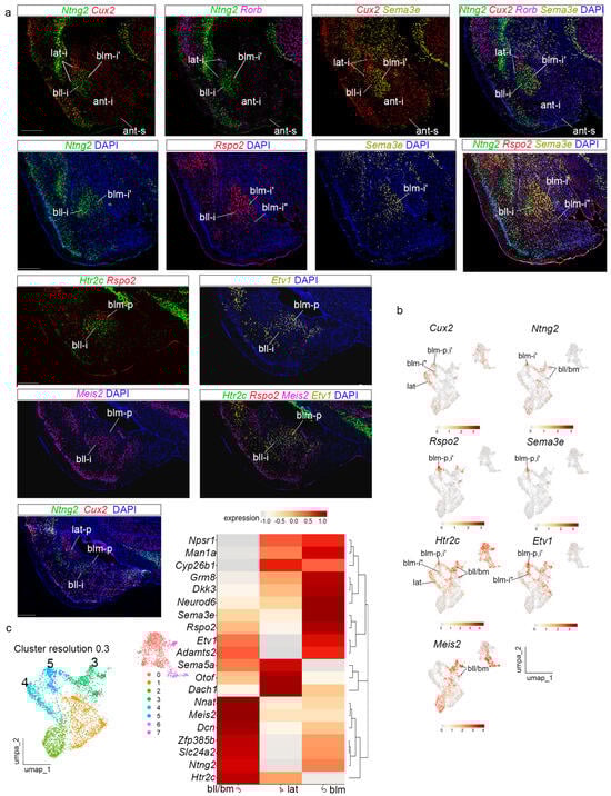 Next, we analyzed cluster 2 at resolution 0.15 (Figure 3e,f). Genes strongly expressed in this domain included Sema3e, Rspo2, Ntng2, Etv1, Adamts2, Slc24a2, Nnat, Dcn, Neurod6, Man1a, Dkk3, Zfp385b, and Grm8. In addition, we checked the expression of Meis2, Htrc2, and Npsr1, also expressed in this cluster. The transcripts of these genes indicated that cluster 2 represents the basal radial domain of Garcia-Calero et al. [22], which was subdivided into basolateral and basomedial radial subdomains (bl and bm). Present results support these subdivisions and further suggest a partition of bl into lateral and medial components (bll, blm). We distinguish now an internal subdivision in the intermediate stratum of blm, namely deep and superficial subregions (blm-i’; blm-i”). Ntng2 and Man1a were expressed in the intermediate and periventricular strata of the whole basolateral subdomain (bll + blm; Figure 6a; see also in situ hybridization image from the AMBA in S7A; UMAP plots for these genes in Figure 6b and Figure S7b). In contrast, Rspo2 transcripts mainly marked the medial subdivision of the intermediate and periventricular basolateral strata (blm-i’, blm-p), which is also selectively labelled by Sema3e, Adamts2, and Npsr1 (Figure 6a and Figure S7a; see UMAP plots in Figure 6b and Figure S7b). Rspo2 transcripts appeared in the superficial blm-i (blm-i”; Figure 6a). Neurod6 and Dkk3 labelled selectively this superficial stratum of blm (blm-i”; Figure S7a; See UMAP plots in Figure S7b). In contrast, Meis2 labelled differentially the intermediate and periventricular strata of the lateral subdivision in the basolateral subdomain (bll-i; Figure 6a; see UMAP plots in Figure 6b). Htr2c showed high expression in the whole bll subdomain (expression pattern and UMAP; Figure 6a,b). Etv1 appeared expressed in the whole intermediate stratum of the basolateral division but showed more numerous transcripts in its medial subdomain (blm-p; Figure 6a and UMAP plot in Figure 6b). Nnat and Dcn labelled the basomedial subdivision of the basal radial domain (bm), in addition to other basal structures (Figure S7a and UMAP in Figure S7b). Other genes, such as Slc24a2, Zfp385b, and Grm8, showed more heterogeneous expression in the basal radial domain (Figure S7a; UMAP plots in Figure S7b). Cyp26b1 showed low amygdalar expression in our snRNAseq experiment (Figure S7a and UMAP plot in Figure S7b). At a higher cluster resolution of 0.3, the basal domain appears subdivided into two clusters (Figure 6c). The heatmap of these genes indicated that the basal domain is subdivided mainly into the described bll + bm and blm radial areas. The bm division of the basal radial unit was not detected specifically among the different clusters obtained, though we clearly can distinguish this partition histologically in our preparations (bm; Figure 6a andFigure S7a). Other negative data refer to the fact that the subpial corticoid plates corresponding to the basal unit (PLCo and caudal CxA) were not specifically detected, possibly again due to molecular similarity with the piriform cortex.
