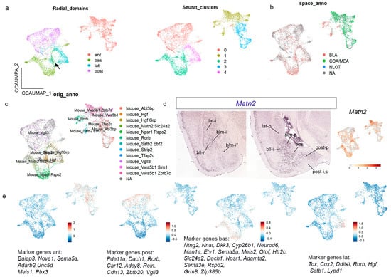 Pallial amygdalar integrated dataset to corroborate transcriptomic evidence of radial domains. (a) UMAP plots of the amygdalar integrated datasets from our own adults and Yu et al. [14] mouse transcriptomic analysis, colored by clusters and radial domains. (b) UMAP plot of the amygdalar integrated dataset colored by amygdalar areas annotated in Yu et al. [14] dataset. (c) UMAP plot of the amygdalar integrated dataset colored by amygdalar cell types annotated in Yu et al. [14] dataset. (d) Matn2 expression pattern in pallial amygdala downloaded from AMBA (right; coronal plane; scale bar 1200 µm) and UMAP for the expression of this gene in the amygdalar integrated dataset. (e) UMAP plots of the amygdalar integrated datasets colored by group of gene expression indicated in each UMAP.