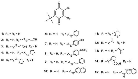 In this study, we aimed to evaluate whether simple low molecular mass 1,4-benzoquinone derivatives exhibit biological activity against key targets implicated in AD pathogenesis. We selected a series of fifteen 1,4-benzoquinone derivatives, each bearing substituents containing sulfur or nitrogen atoms. These heteroatoms were chosen as we hypothesized that they could significantly influence the electron density of the quinone core, thereby affecting its interaction with amino acid residues within enzyme active sites. Furthermore, electron-donating substituents are expected to enrich the quinone ring’s electron density, rendering the system less susceptible to nucleophilic attack by biological nucleophiles—an effect that may contribute to reduced toxicity [30,31].
