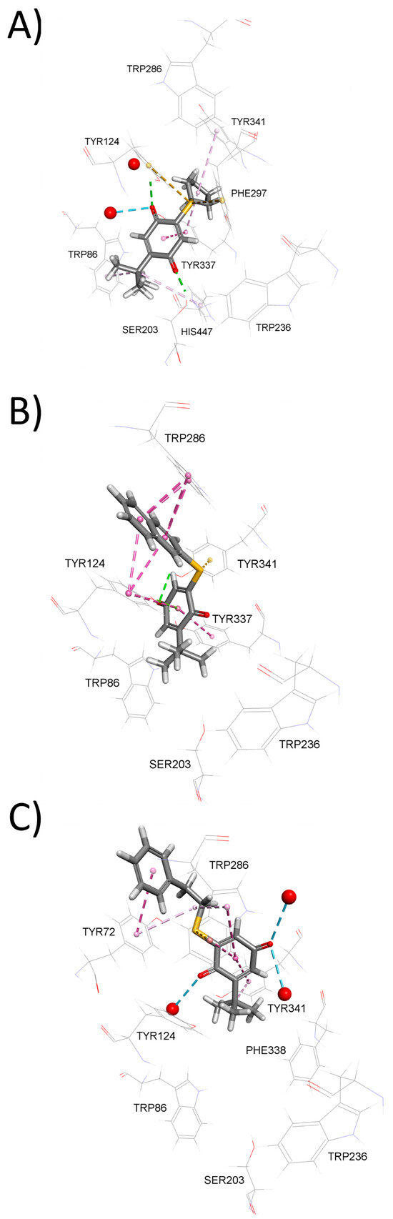 The binding modes predicted from the graphical Hunter–Downs evaluation were confirmed utilizing a flexible molecular docking approach to model the interactions of compounds 5, 9, and 10 within the AChE active site gorge. According to Hunter–Downs plot, compounds 5, 9, and 10 were classified as competitive, non-competitive, and mixed-type inhibitors, respectively. Molecular docking predicted that compound 5 predominantly occupies the lower part of the AChE active site gorge (Figure 2A), corresponding to the catalytic anionic site (CAS). It engages in non-bonding interactions with two residues from the catalytic triad (Ser203 and His447), as well as Trp86 and Tyr337 from the choline-binding site and Phe297 from the acyl pocket. Compound 5 is also predicted to interact with the peripheral anionic site (PAS) residues Tyr124 and Tyr341, but not with the more solvent-exposed PAS residues Tyr72 and Trp286. In contrast, mixed-type inhibitor 10 is predicted to occupy mainly the upper part of the AChE active site gorge (Figure 2B) and interact with PAS residues Tyr124, Tyr341, and Trp286. It also interacts with at least one CAS residue, namely the choline-binding site residue Tyr337, and notably, its tert-butyl group protrudes into CAS. Finally, the non-competitive inhibitor 9 is predicted to bind exclusively at the entrance of the AChE gorge (Figure 2C), interacting only with PAS residues Tyr72, Trp286, and Tyr341, while directing its phenethyl ring toward the solvent. Importantly, in all three cases, the compounds are predicted to interact with neighboring residues via their sulfur atoms (Figure S1), highlighting the significance of non-covalent interactions involving sulfur for stabilizing the compounds within the AChE active site [43,52]. Two-dimensional representations of the modeled complexes for AChE with the tested compounds are provided in the Supporting Information (Figures S2 and S3).