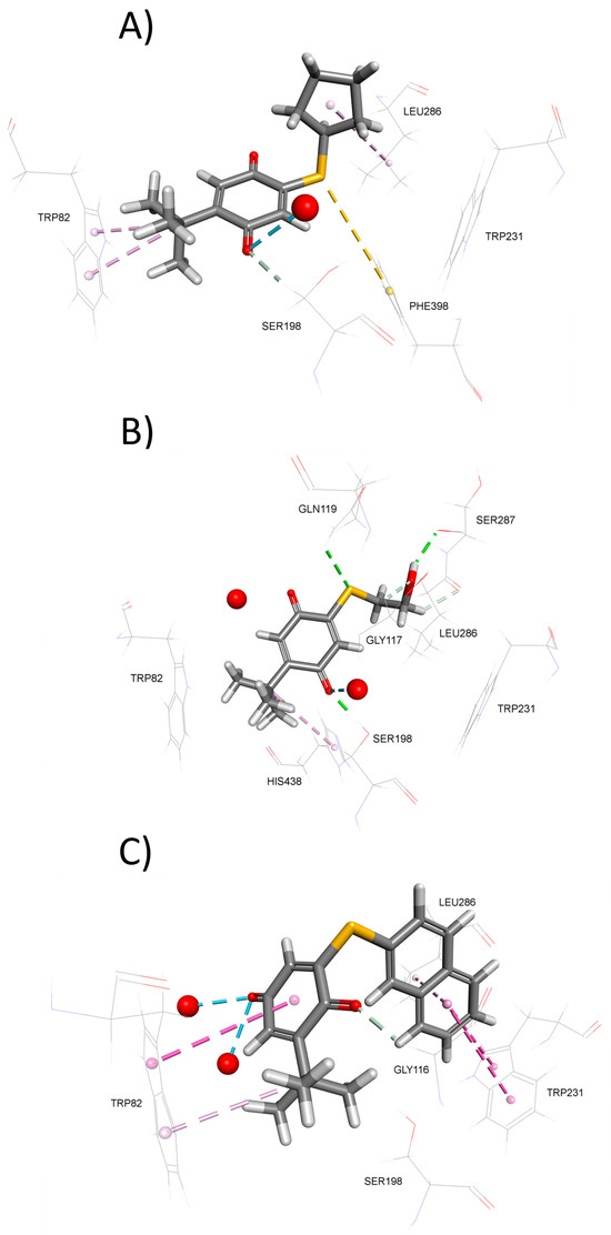 The tested compounds inhibited AChE with Ki constants ranging from 21 to 136 μM. Although these values span approximately one order of magnitude, the Ki constants for most compounds were similar to that of compound 1, which represents the structural scaffold of the series. The most potent inhibitor was compound 14 with a proline (Ki = 21 μM) in para-position relative to tert-butyl group, followed by compound 9, featuring thiophenethyl-substituent (Ki = 24 μM) in the meta-position, and compound 5, which contains thiocyclopentane in para position relative to the tert-butyl group (Ki = 29 μM). The weakest inhibition potency was observed for compound 6, which bears a thiobenzen substituent in the meta position relative to the tert-butyl group. Its potency was approximately five times lower than that of the most active compounds mentioned above. Although the series includes a relatively small number of compounds and a comprehensive structure–activity relationship (SAR) analysis cannot be performed, some general trends can be observed. The obtained data suggest that AChE prefers thio-substitunts in the para over the meta position relative to the tert-butyl group on quinone. Specifically, compounds 5 and 3 exhibit approximately 1.7-fold higher inhibition potency compared to their meta position counterparts, compounds 4 and 2, respectively. Moreover, as these analogs are regioisomers at the C(5) and C(6) positions, this suggests that AChE displays a certain degree of regioselectivity, favoring C(5) over to C(6) regioisomers. The observed regioselective preferences suggest that electronic effects contribute to the inhibition potency, likely due to the synchronized electron-donating and electron-withdrawing properties of the tert-butyl and alkylthio groups, respectively. These effects appear to be more harmonized in the C(5) isomer. The electron-withdrawing effect of the sulfur atom arises from its higher electronegativity compared to carbon, while its electron-donating character is attributed to the presence of free electrons in conjunction with a π-aromatic system. The alkylthio group is an electron-withdrawing group due to enhanced electronegativity of sulfur compared to the carbon atom and is an electron-donating group due to the presence of free electrons in conjunction with a π-aromatic system of 1,4-benzoquinone. However, overlapping during electron delocalization is not favorable due to the discordance in orbital size, and therefore, the studied thio-groups should be considered electron-withdrawing groups. Compared to galantamine and donepezil [50], drugs used for the treatment of AD, com-pounds 14, 9, and 5 (the most potent AChE inhbitors from the series), were about 54 and 1166 times, respectively, less potent as inhibitors of AChE.