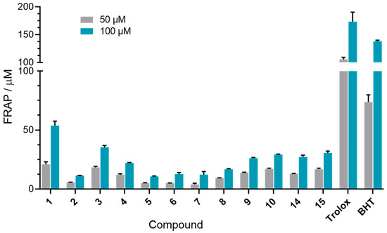 The first assay used was the FRAP assay, which assesses the reducing ability of compounds via an electron transfer mechanism [55]. The ability to reduce Fe3+ to Fe2+ was tested for twelve out of fifteen para-benzoquinones, selected based on their AChE and BChE inhibition profiles. Only compounds that inhibited at least one of the enzymes with Ki values less than 200 μM were included. The antioxidant activity was measured at 50 and 100 μM, concentrations chosen based on their determined Ki values. The obtained FRAP values (Figure 4) showed that tested benzoquinones exhibited poor to moderate antioxidative activity when compared to standard antioxidants Trolox and BHT. No clear trend in activity was observed between the C(5)- and C(6)-regioisomers. Among all of the tested compounds, compound 1 displayed the highest antioxidant potential, though it was still approximately three times less potent than BHT. In a previous study [56], compounds 1, 6, and 11 were evaluated for antioxidant activity using the DPPH assay, which is based on a mechanism involving either electron transfer or hydrogen atom transfer from the antioxidant to the DPPH radical, simulating lipid oxidation inhibition [57]. In that study, all three compounds were found to be approximately twice as potent as ascorbic acid, with compound 1 showing the strongest activity and compound 11 the weakest. These results are consistent with our FRAP findings and support the conclusion that the antioxidant mechanism of these benzoquinones is primarily based on electron transfer.