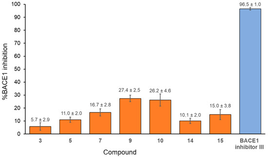To evaluate their potential impact on the formation of amyloid-β plaques found in the brains of people with AD, benzoquinones were tested as inhibitors of BACE1, the enzyme responsible for the initial β-amyloid peptide formation. From the series of fifteen compounds, seven compounds (3, 5, 7, 9, 10, 14, and 15) were selected based on their ability to inhibit the action of AChE and/or BChE. All of the selected compounds inhibited the activity of BACE1 with percentages of inhibition ranging from 5.7 to 27.4% (Figure 5). The highest inhibition, 27.4% and 26.2%, was observed for compounds 9 and 10, which bear phenethylthio and 2-naphthylthio substituents, respectively. The fact that the lowest inhibition was obtained with compound 3 (5.7%) with 2-hydroxyethylthio as a substituent pointed to the importance of compound volume as a contributor to the inhibitory potency of 1,4-benzoquinones. This finding aligns with previous reports where 1,4-benzoquinones featuring longer side chains inhibited BACE1 activity in the medium nM to low µM range [26,59]
