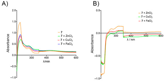 Example of biometal chelation experiment. (A) UV/Vis spectra of 7 alone (orange) and in the presence of Zn2+ (green), Cu2+ (red), and Fe2+ (blue) recorded after 60 min of incubation; (B) differential spectra of 7-Zn2+ (orange), 7-Cu2+ (green), and 7-Fe2+ complex (red).