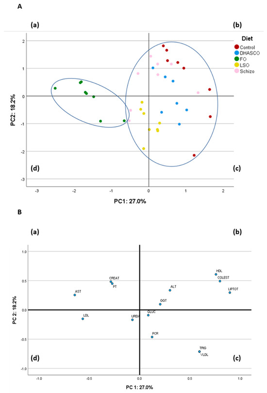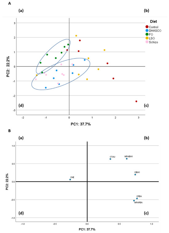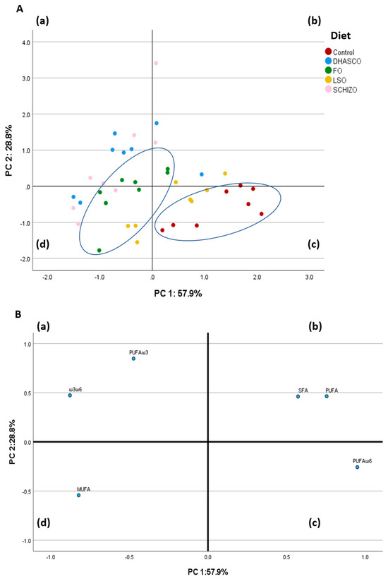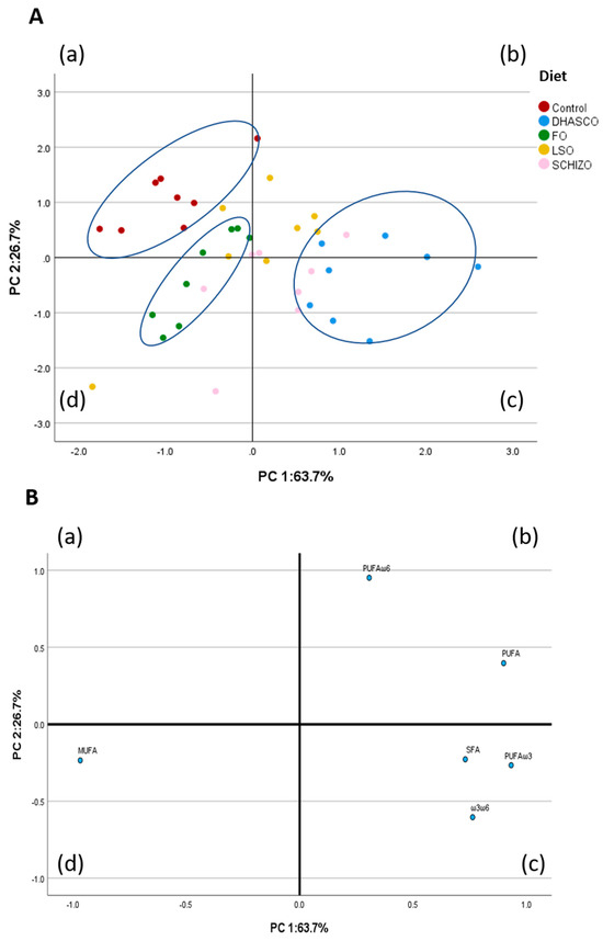 The statistical analysis was carried out with SAS [47] software, version 9.1 using the generalized linear mixed (GLM) model. The normality of data was checked by Kolmogorov–Smirnov test, and the variance homogeneity was verified by Levene’s test. Significant multiple comparisons were performed using the PDIFF option adjusted with the Tukey–Kramer test to find statistical differences among diets. Pearson’s correlation coefficients were calculated using the Proc CORR procedure of SAS to find linear relationships among parameters. The principal component (PC) analysis was performed, using the proc PRINCOMP of SAS, to assess relationships between variables. After data normalization, the analysis was based on the correlation matrix, and PC were considered significant if they contributed more than 5% of the total variance. Data are presented as mean and SEM (standard error of the mean). p < 0.05 was chosen as the cut-off for statistical significance between dietary groups.