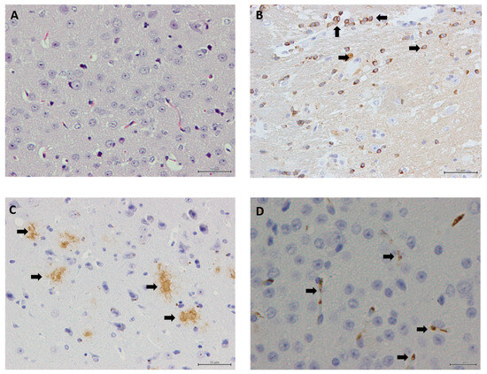 For immunohistochemistry assays, the brain sections were subjected to antigen retrieval with citrate buffer (pH 6.0) at 96 °C for 20 min using PTLink equipment (DAKO, LusoPalex, Portugal). The sections were washed 2× with distilled water for 5 min, treated with H2O2 to quench endogenous peroxidase activity (Envision FLEX Kit, catalogue #K8000, DAKO, LusoPalex, Portugal) for 15 min, and then washed 2× in PBS for 5 min. The sections were incubated with β-amyloid recombinant rabbit monoclonal antibody (H31L21) (1:500, Invitrogen, ThermoScientific, Waltham, MA, USA, catalogue #700254, RRID: AB_2532306), TAU recombinant rabbit monoclonal antibody (1:100, Invitrogen, ThermoScientific, catalogue #MA5-41098, RRID: AB_2898852), and IBA1 polyclonal antibody (1:100, Invitrogen, ThermoScientific, catalogue #PA5-27436, RRID: AB_2544912) for 1 h. After incubation, the sections were washed again 2× in PBS for 5 min, incubated with donkey biotinylated anti-rabbit IgG (H + L) cross-absorbed secondary antibody (1:500, Invitrogen, ThermoScientific, catalogue #31458, RRID: AB_228213) at RT for 30 min, washed 2× in PBS for 5 min, and developed with DAB (1:20, Envision FLEX Kit, DAKO, catalogue #K8000, LusoPalex, Portugal) for 5 min. Sections were washed 2× with distilled water for 5 min, stained with Harris hematoxylin (Bio-Optica) for 1 min, washed 2× with distilled water for 5 min, dehydrated with increasing concentrations of ethanol, cleared with xylene, and covered with Entellan mounting reagent (Merck, VWR International, Radnor, PA, USA).