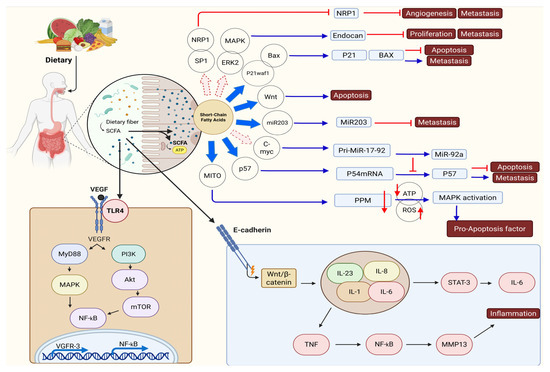 Urolithin A (UA) suppresses MAPK activation in LPS-stimulated macrophages by blocking p38 and JNK phosphorylation, reducing pro-inflammatory factors, and slowing tumor growth. In colon cancer cells, butyrate triggers MAPK signaling, decreasing proliferation and increasing apoptosis by enhancing TLR4 expression. Stimulating the phosphatidylinositol-3-kinase (PI3K) and the serine/threonine protein kinase (Akt) pathway enhances cell proliferation and survival; inhibiting it induces apoptosis [72]. PI3K produces phosphatidylinositol (3, 4, 5)-trisphosphate when detecting survival signals. PDK1 and mTOR activate Akt, altering proteins linked to apoptosis. SCFAs in colon cancer cells suppress PI3K/Akt signaling to induce apoptosis by reducing BAD phosphorylation, promoting cytochrome c release from mitochondria, and increasing caspase-3 levels. KYNA reduces Akt phosphorylation to prevent colon cancer cell proliferation; UA acts similarly on the PI3K/Akt/mTOR pathway in pancreatic ductal adenocarcinoma (PDAC), combating cancer by inhibiting Akt phosphorylation and p70 ribosomal S6 protein kinase (p70S6K). UA also reduces inflammation in chronic alcoholic pancreatitis. LCA upregulates miR21 in colon cancer cells, inhibiting phosphatase PTEN. S-equol hinders breast cancer MCF-7 cell growth by enhancing miR-10a-5p expression that targets PIK3CA’s 3′ UTR to repress the PI3K/Akt pathway [86,87].