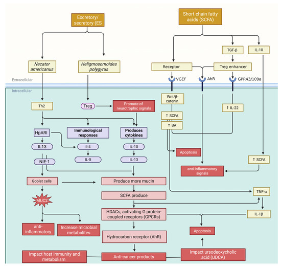 Through a complicated web of interactions with the host microbiota, intestinal roundworms cause significant alterations in the gut microbial metabolite composition. These changes are brought about by some interrelated processes that provide the intestinal lumen with its distinct metabolic environment [169]. Helminths release immunomodulatory substances like ES-62 and HpARI at the molecular level, which tilt host immunity in favor of a Th2 response. This change increases the production of specific cytokines, such as IL-4 and IL-13, which modify the expression of genes in bacteria involved in the metabolism of carbohydrates. Interestingly, these cytokines increase the activity of glycosidase in bacteria such as Bacteroides thetaiotaomicron, which results in a more effective breakdown of complex polysaccharides and a higher production of SCFAs [171,172].
