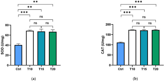 An aliquot of the homogenate was centrifuged at 10,000× g for 10 min at 4 °C. The supernatant was further centrifuged at 8000× g for 15 min to obtain a clear supernatant which was used to measure superoxide dismutase (SOD) and catalase (CAT) activities [71]. The Bradford assay (BioRad, Hercules, CA, USA) was used to measure the protein concentration.