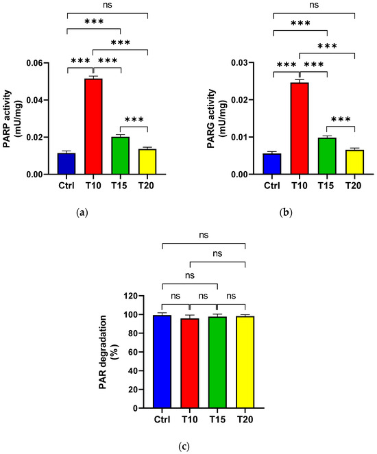 Figure 2. PARP (a) and PARG (b) activities, as well as the percentage of PAR degradation (c), were measured in zebrafish eyes from control (Ctrl), and aluminium-exposed groups at 10 (T10), 15 (T15), and 20 (T20) days. Data are presented as mean ± SD. Asterisks indicate statistically significant differences between the compared groups (*** p < 0.001); ns indicates not significant.