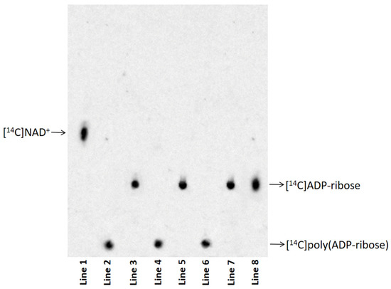 [14C]poly (ADP-ribose) purified from eye homogenates exposed to Al for 10 (line 2), 15 (line 4), and 20 (line 6) days and their respective degradation products by PARG (line 3, line 5, and line 7) were analysed via thin-layer chromatography. [14C]NAD+ (line 1) and [14C]ADP-ribose (line 8) were used as nucleotide standards (Figure 3). The disappearance of the radioactive signal at the TLC loading point, and the simultaneous appearance of a signal co-migrating with the standard ADP-ribose were demonstrated in all analysed samples (Figure 3). These results indicated that the protein-free polymers were completely degraded to ADP-ribose.