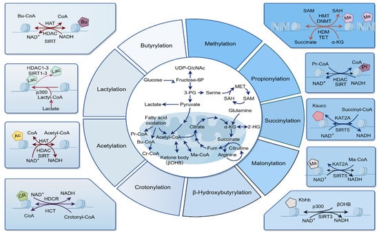 - Sabari, B.R.; Zhang, D.; Allis, C.D.; Zhao, Y. Metabolic regulation of gene expression through histone acylations. Nat. Rev. Mol. Cell Biol. 2017, 18, 90–101. [Google Scholar] [CrossRef]