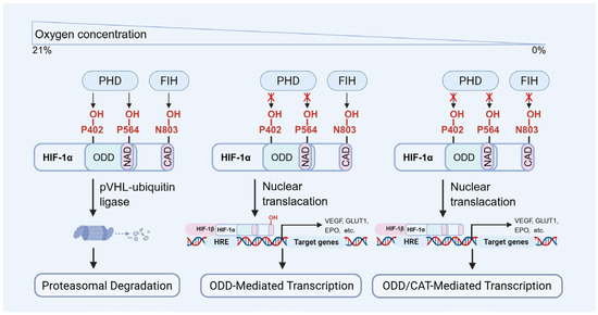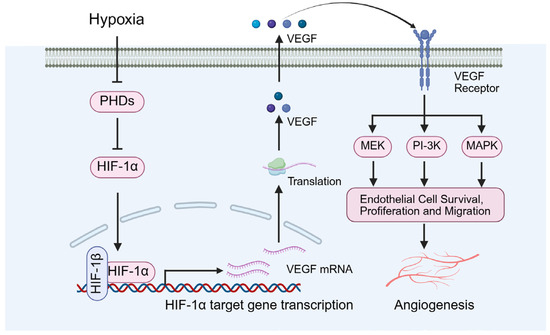Under normoxic conditions, HIF-1α is hydroxylated by prolyl hydroxylases (PHDs) and subsequently recognized by the von Hippel–Lindau protein (VHL, Figure 2), which mediates its ubiquitin-dependent proteasomal degradation [23,32,33,34,35]. While under hypoxic conditions, HIF-1α escapes hydroxylation, becomes stabilized, translocated into the nucleus, and dimerizes with HIF-1β to form an active transcriptional complex (Figure 2). This complex binds to hypoxia response elements (HREs) of target genes, thereby initiating their transcription and promoting adaptive cellular responses, including angiogenesis, enhanced glycolysis, and survival signaling. The principal function of HIF-1α is to facilitate cellular adaptation to hypoxia by regulating metabolism and promoting cell viability across diverse tissue types [23,36,37,38]. Its transcriptional targets include VEGF, erythropoietin (EPO), GLUT-1, and acetyl-CoA synthetase, among others. The regulatory scope of HIF-1α encompasses diverse biological processes, including metabolic reprogramming, neovascularization, anti-apoptotic signaling, autophagy activation, and modulation of inflammatory responses [23,31,39].