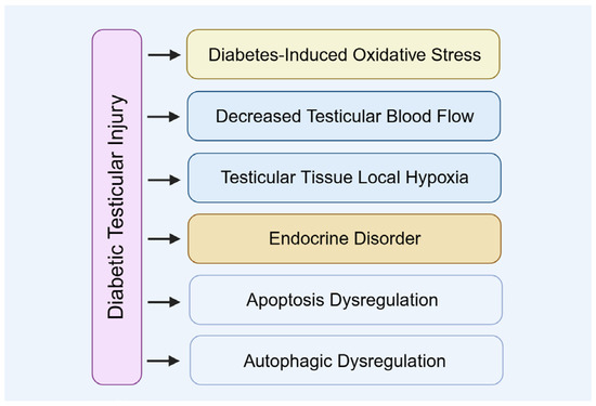 The mechanism underlying diabetic testicular injury is a complex process involving multiple physiological alterations (Figure 3). Metabolic disturbances and microcirculatory impairments caused by diabetes directly compromise testicular health, subsequently disrupting testosterone synthesis and spermatogenesis.