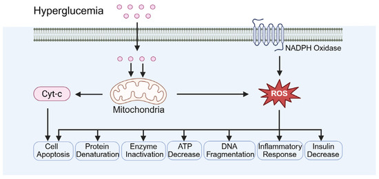 Diabetes-induced oxidative stress. Cyt-c: cytochrome. ROS: reactive oxygen species.