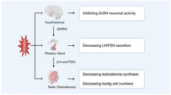 Diabetes-induced hyperglycemia suppresses testosterone production and causes hypogonadism, which is a key contributor to male infertility (Figure 6). Additionally, inflammatory responses in the male reproductive tract, often exacerbated under diabetic conditions, can impair spermatogenesis and reduce sperm count. These changes, together with coexisting andrological conditions such as varicocele or infection, may synergistically worsen testicular function in diabetic individuals. Musa and Graziani et al. demonstrated that reduced testosterone is closely associated with sexual dysfunction, diminished sperm quality, and decreased fertility [7,60]. Furthermore, Lotti and Facondo et al. indicated that low testosterone correlates significantly with reduced sperm concentration and total sperm count, thereby exacerbating male infertility [8,61]. Pelusi revealed that diabetes disrupts the hypothalamic-pituitary-gonadal (HPG) axis, causing hormonal imbalances that culminate in impaired testicular function, characterized by decreased testosterone production and defective spermatogenesis [62]. Additionally, Abd El-Twab et al. found significant downregulation of luteinizing hormone (LH) and follicle-stimulating hormone (FSH) receptor expression in the testes of diabetic patients, contributing to reduced testosterone synthesis [63].