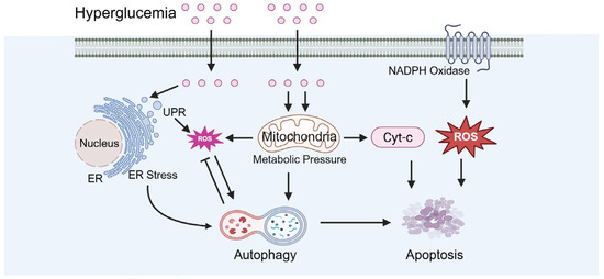Diabetes-caused dysregulation of apoptosis and autophagy. ER: endoplasmic reticulum, UPR: unfolded protein response.