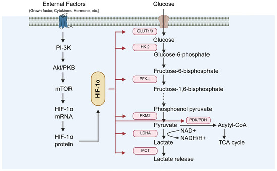 Under diabetic conditions, activation of HIF-1 enhances testicular cell adaptability to hypoxia by improving glucose uptake and promoting metabolic reprogramming (Figure 9). Xiong et al. demonstrated that HIF-1α upregulates GLUT-1, thereby increasing cellular glucose uptake [77], and also regulates the expression of the glycolytic enzyme LDHA, facilitating metabolic adaptation under hypoxic conditions [77]. Furthermore, Liu ad Han et al. revealed that HIF-1α optimizes cellular energy metabolism and survival through PI-3K/AKT/mTOR signaling activation [15,78].