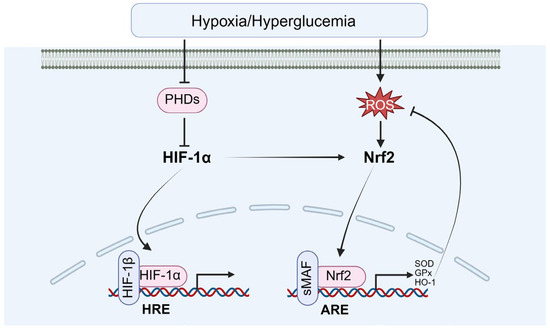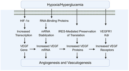 In addition, under diabetic conditions, the upregulation of HIF-1α is generally regarded as an adaptive response that promotes angiogenesis by inducing the expression of genes such as VEGF (Figure 5), thereby enhancing tissue oxygenation [58,59]. However, chronic hyperglycemia may disrupt the normal function of HIF-1α, resulting in dysregulation of its signaling pathway [58,59].