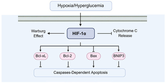 In addition, HIF-1α participates in apoptosis and autophagy in a time- and context-dependent manner, potentially exerting either protective or detrimental influences at different stages (Figure 7). Wang et al. demonstrated that, under hypoxic conditions, HIF-1α upregulates Bcl-2 while downregulating Bax, thereby inhibiting apoptosis [74]. Conversely, under certain pathological states, HIF-1α may promote apoptosis through activation of Bax and caspase-9 [74]. Furthermore, Pan and Abo et al. revealed that in hypoxic environments, HIF-1α can induce autophagy by upregulating Beclin-1, which contributes to cellular protection against damage [75,76].