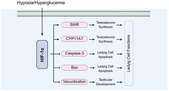 HIF-1α directly influences testosterone production in Leydig cells by regulating the expression of steroidogenic enzymes (Figure 6). Dhole et al. demonstrated that HIF-1α enhances steroid hormone and VEGF production through activation of downstream signaling pathways, including the cyclic adenosine monophosphate (cAMP)-protein kinase A (PKA) pathway [66]. Additionally, Sui et al. found that under hypoxic conditions, HIF-1α modulates steroidogenesis by regulating StAR expressions [67].