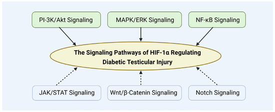 In addition, HIF-1α expression is also regulated by other signaling, including JAK/STAT pathway [130], Wnt/β-catenin pathway [131], and Notch pathway [132]. These pathways may also contribute to modulating HIF-1α’s role in diabetic testicular damage.