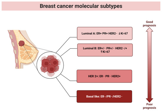 According to the intrinsic classification proposed by Perou and Sørlie in 2000 [22], (BC) can be divided into four molecular subtypes: Luminal A and Luminal B (both characterized by estrogen receptor (ER) expression), basal-like (lacking ER, progesterone receptor (PR), and epidermal growth factor receptor 2 (HER2) expression—commonly referred to as triple-negative breast cancer (TNBC)), and HER2-enriched (lacking ER but overexpressing HER2).