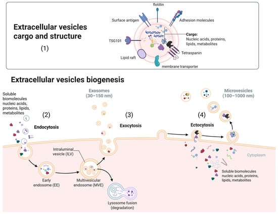 EVs are a heterogeneous group of membrane-bound particles that include several subtypes based on their size and origin (Figure 2). These include apoptotic bodies (500 nm to 2 µm in diameter), microvesicles (100 nm to 1 µm), exosomes and small extracellular vesicles (sEVs) (30 to 150 nm) [29,30], and oncosomes (1 to 10 µm) [31,32]. However, current literature states different size limits for each category. In this regard, the Minimal Information for Studies of Extracellular Vesicles (MISEV) guidelines should be taken into consideration. An updated version was released in December 2023, which states the following EV size categories: sEVs under 200 nm in diameter, and large EVs over 200 nm in diameter. Other terms, such as exosomes, ectosomes or microvesicles are not recommended unless the subcellular origin is demonstrable [33].