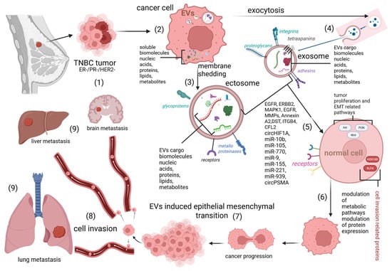 Simplified scheme of regulation and tumor progression via active regulatory biomolecules contained in EVs. (1) A breast lump represents a TNBC tumor, characterized by negative expression of PR, ER, and HER2+ receptors. (2) In the tumor cell, biogenesis of EVs occurs, involving the packaging of soluble regulatory factors directly into the cell membrane during membrane shedding (ectocytosis), resulting in ectosomes (microvesicles) that contain specific membrane molecules and cargo. (3) The biogenesis of EVs in cancer cells culminates in exocytosis, during which exosomes are secreted into the extracellular environment. (4) These exosomes are characterized by specific membrane molecules and contain cargo that includes regulatory molecules. Ectosomes, exosomes, and other EVs with cargo consisting of specific regulatory molecules such as miRNA, circRNA, and proteins are directed to their destinations, which may include normal cells. (5) Regulatory molecules target specific metabolic pathways and protein expression regulators in normal cells, thereby modulating metabolic pathways. (6) In this particular case, this modulation leads to cancer progression, EMT (7), and ultimately cell invasion (8), resulting in metastasis to distant organs (9).