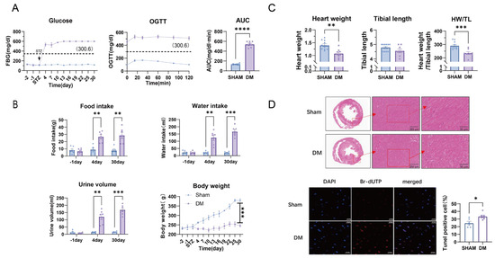 Confirmation of type 1 DM rat model and examination of myocardial structure and apoptosis. (A) FBG over 4 weeks (n = 11), OGTT, and mean values of area under the curve of OGTT (n = 8). (B) Changes of food intake (FI), water intake (WI), urine volume (UV), and body weight (BW) in sham and DM (n = 6). (C) Heart weight (HW) and tibia length (TL) and their ratios in sham and DM. (D) H&E staining of rat myocardial tissue (n = 4) and Tunel fluorescence staining results (n = 6). Means ± SEM, * p < 0.05, ** p < 0.01, *** p < 0.001, **** p < 0.0001.