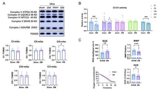 The protein expressions and activities of mitochondrial complexes and mitochondrial function. (A) The expressions of mitochondrial complex subunits in sham and DM rat hearts (n = 6). Original Western blot images can be found in Figure S2. (B) The activity of mitochondrial complexes CI–CV in each group (n = 6). (C) The level of ROS, MMP in myocardial mitochondria (n = 11) and OCR (n = 8) in sham and DM. Means ± SEM, * p < 0.05, ** p < 0.01, *** p < 0.001.