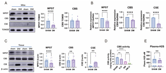 mRNA, protein and activity determination of H2S producing enzymes in sham and DM rat heart and mitochondria. (A) Protein expressions of MPST and CBS in isolated heart mitochondria of sham and DM (n = 6). (B) Protein expressions of MPST, CBS, and CSE in sham and DM rat heart tissue (n = 6). (C) mRNA expressions of CSE, CBS, and MPST in sham and DM rat heart tissue (n = 5). (D) Activity of CBS in cardiac mitochondria of sham and DM (n = 6). (E) Plasma H2S levels in sham and DM rats (n = 8). Original Western blot images can be found in Figure S3. Means ± SEM, ** p < 0.01, *** p < 0.001, **** p < 0.0001.