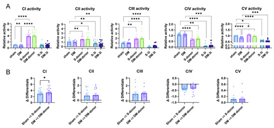 Activities of cardiac mitochondrial complexes I–V and comparisons of the activities of cardiac mitochondrial complexes induced by NaHS. (A) The activity of mitochondrial complexes CI–CV under the treatment of H2S donor, NaHS, and H2S enzyme inhibitors (n = 6). (B) Changes in the activity of cardiac mitochondrial oxidative phosphorylation complexes by NaHS in sham and DM (n = 6). Means ± SEM, * p < 0.05, ** p < 0.01, *** p < 0.001, **** p < 0.0001.