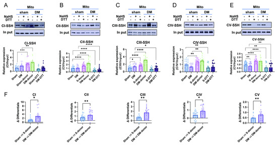 Detection of the S-sulfhydration of cardiac mitochondrial complexes I–V and comparisons of the S-sulfhydration of cardiac mitochondrial complexes induced by NaHS. (A–E) The S-sulfhydration of cardiac mitochondrial complex I–V under basal conditions and with a H2S donor, NaHS (n = 6), and an antioxidant, DTT. (F) NaHS-induced increases in the S-sulfhydration of complexes CI–CV in sham and DM (n = 6). Original Western blot images can be found in Figure S4. Means ± SEM, * p < 0.05, ** p < 0.01, *** p < 0.001, **** p < 0.0001.