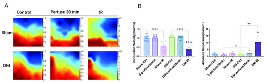 Electrical mapping measurement of electrical conductance and inhomogeneity in sham and DM hearts. (A,B) Epicardial conduction velocity of monophasic action potentials in sham and DM hearts under normal conditions with continuous perfusion and after ischemia-reperfusion (n = 4). Means ± SEM, * p < 0.05, ** p < 0.01, **** p < 0.0001.