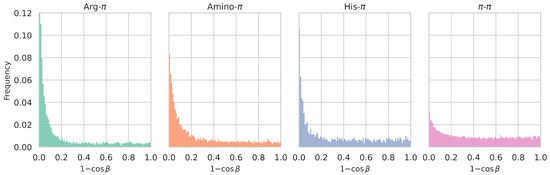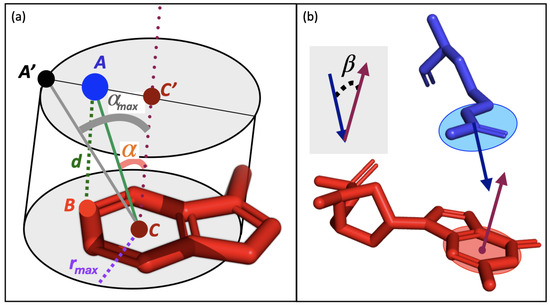 - The distance between the two interacting partners. Sometimes, this distance is defined as the distance between the centroids of the two interacting functional groups. In other studies, like here, it is defined as the closest distance between any two atoms of the two functional groups. We chose this distance definition because the considered aromatic moieties carry various substituents which influence how the ring interacts with other partners and breaks the symmetry around the ring’s center. Similarly, the electron delocalization in other functional groups is better captured by selecting the closest atom rather than the functional group’s centroid.