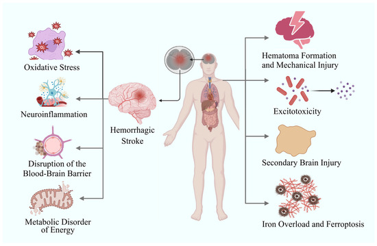 With the increase in aging and people’s current sub-healthy lifestyle, stroke, as the main clinical type of cerebrovascular diseases, has become the second leading cause of human death. Together with heart disease and malignant tumors, it constitutes the three major diseases that cause death and disability in humans [1,2]. According to statistics, stroke causes 5.5 million deaths globally every year, and half of the survivors are left with complications such as disabilities [1]. Approximately 20% of strokes are hemorrhagic strokes, and 80% are ischemic strokes [3]. In stroke patients, brain cells will suffer continuous and irreversible damage. After hemorrhagic strokes, the extravasation of blood components activates microglia and astrocytes, which release pro-inflammatory factors to trigger neuroinflammation [4] and exacerbate neuronal damage. Meanwhile, hemoglobin degradation products induce the production of a large amount of reactive oxygen species, triggering oxidative stress and damaging the structures of lipids, proteins, and nucleic acids [5,6,7]. The mechanical pressure from blood accumulation, combined with inflammatory mediators, leads to the disruption of tight junctions in the blood–brain barrier [8], increased vascular permeability, and subsequent cerebral edema. In addition, iron ion deposition inhibits mitochondrial respiratory chain function, resulting in reduced ATP production and energy metabolism disorders, which further exacerbate neuronal apoptosis. These pathological processes superimpose on each other, forming secondary post-hemorrhagic injury, expanding the scope of brain damage and worsening neurological deficits (Figure 1). And these pathophysiological mechanisms can further cause other complications, such as post-stroke depression [9], cognitive impairment [10], epilepsy [11], and dysphagia [12].