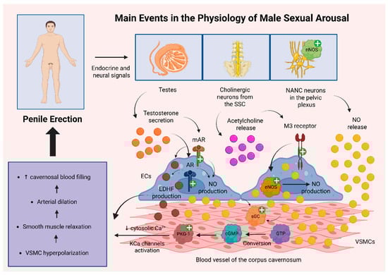 Key pathophysiological mechanisms underlying penile erection. NO plays a central role in the regulation of male erection, with two primary sources: (1) activation of nNOS in NANC neurons of the pelvic plexus, leading to direct NO release into VSMCs, and (2) activation of eNOS in endothelial cells upon stimulation of muscarinic M3 receptors by Ach released from cholinergic neurons in the SSC, with NO subsequently diffusing to VSMCs. In both cases, NO activates sGC in VSMCs, catalyzing the conversion of GTP to cGMP. Elevated cGMP levels activate PKG-1, which in turn decreases cytosolic calcium concentrations and activates KCa channels, resulting in VSMC hyperpolarization. Testosterone also enhances NO production via activation of androgen receptors (ARs and mARs), contributing to both nNOS and eNOS pathways. Additionally, testosterone stimulates the production of EDHFs, which further support VSMC hyperpolarization. The resulting hyperpolarization induces smooth muscle relaxation and vasodilation, leading to increased cavernosal blood flow and penile erection [20,21,22,23,24,25,26]. Abbreviations: Ach: acetylcholine; AR: androgen receptor; cGMP: cyclic guanosine monophosphate; ECs: endothelial cells; EDHF: endothelium-derived hyperpolarizing factor; eNOS: endothelial nitric oxide synthase; GTP: guanosine triphosphate; KCa: calcium-dependent potassium; M3 receptor: muscarinic M3 receptor; mAR: membrane-bound androgen receptor; NANC: non-adrenergic, non-cholinergic; nNOS: neuronal nitric oxide synthase; NO: nitric oxide; PKG-1: protein kinase G type 1; sGC: soluble guanylyl cyclase; SSC: sacral spinal cord; VSMC: vascular smooth muscle cell; +: activation; ↑: increase; ↓: decrease. Created in BioRender. Kounatidis, D. (2025) https://BioRender.com/rykt1qj (assessed on 27 August 2025).
