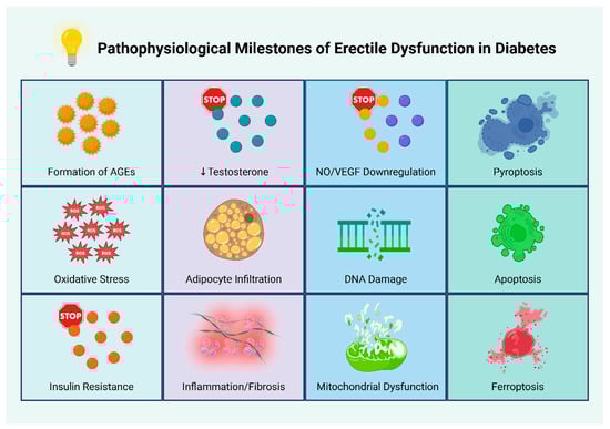 Pathophysiological milestones of erectile dysfunction in diabetes. Abbreviations: AGEs: advanced glycation end products; NO: nitric oxide; ROS: reactive oxygen species; VEGF: vascular endothelial growth factor [28,29,30,31,32,33,34,35,36,37,38,39,40,41,42,43,44,45,46,47,48,49,50,51,52,53,54,55,56,57,58,59,60,61,62,63,64,65,66,67,68,69]. Created in BioRender. Kounatidis, D. (2025) https://BioRender.com/ebz5ezk (assessed on 28 July 2025).