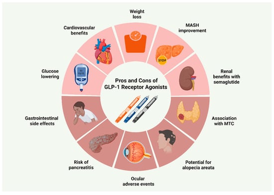 With the increasing adoption of GLP-1 RAs, less common adverse effects are receiving increased attention. Recent pharmacovigilance data have implicated GLP-1 RAs, particularly semaglutide, in the development of androgenetic alopecia [95,96]. The precise mechanisms remain insufficiently defined, with available data relying largely on speculations. The leading hypothesis posits that rapid weight loss may induce metabolic and nutrient alterations that trigger telogen effluvium [97]. Ocular safety has also emerged as a key consideration in GLP-1 RA therapy, encompassing worsening of diabetic retinopathy (DR), particularly in semaglutide users with pre-existing DR at baseline, as well as ischemic optic neuropathy (ION) [75,98,99]. Current evidence suggests that these effects are more likely attributable to rapid improvements in glycemic control rather than a direct pharmacological action of GLP-1 RAs. In contrast, other investigations have not confirmed this association, while preclinical research has suggested a potential protective role through modulation of the ROCK2 pathway within the retinal microvasculature [100,101,102,103]. Of note, a very recent in vitro study demonstrated that semaglutide exerted potent antioxidative and cytoprotective effects in retinal endothelial cells, thereby facilitating wound healing [104]. Figure 3 summarizes the main advantages and disadvantages of GLP-1 RA prescription.