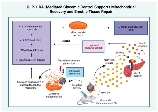 Emerging evidence indicates that GLP-1 RAs may have therapeutic potential in diabetes-related ED through a mitochondria-targeted, piezoelectric nanosystem. In a diabetic mouse model of ED, ultrasound-activated barium titanate (BaTiO3)-based nanosystem (BaTCG) generated localized piezoelectric currents that consumed protons (H+) on the mitochondrial outer membrane. This process reduced mitochondrial matrix H+ availability, collapsed the mitochondrial membrane potential, and triggered mitophagy, thereby attenuating oxidative stress, inflammation, and apoptosis. Simultaneously, the nanosystem enabled sustained release of long-acting GLP-1 RAs, which activated pancreatic β-cell receptors to enhance insulin secretion and improve glycemic control. The combined effects of restored metabolic balance, reduced mitochondrial injury, and suppressed inflammation promoted tissue regeneration within the corpus cavernosum, ultimately improving erectile function. Figure 4 provides a schematic representation of this nanosystem, highlighting the role of GLP-1 RA-mediated glycemic regulation in mitochondrial recovery and erectile tissue repair [132]. Several similar nanoplatforms have demonstrated promise in optimizing antidiabetic therapy; however, their clinical application remains investigational [133].