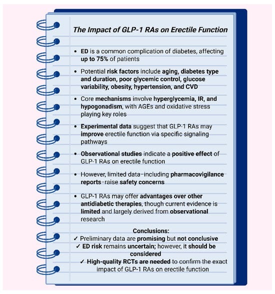 In conclusion, ED represents a common yet frequently underrecognized microvascular complication of diabetes, influenced by a broad spectrum of risk factors. Emerging preclinical and clinical evidence suggests that GLP-1 RAs may exert beneficial effects on erectile function, potentially exceeding those of other antidiabetic therapies. Nevertheless, conclusions remain premature. Concurrently, recent reports have raised concerns regarding possible ED development among GLP-1 RA users. However, these observations are limited by methodological shortcomings, and the strength of the association appears weak. Further mechanistic investigations are warranted to delineate the underlying biological pathways, while rigorously designed, long-term RCTs with erectile function as a predefined primary endpoint are essential. Until such data become available, clinicians should remain vigilant for symptoms of ED following the initiation or dose titration of GLP-1 RAs and be prepared to implement appropriate therapeutic strategies. Figure 5 summarizes the key features of diabetes-related ED and outlines the current evidence regarding the effects of GLP-1 RAs on erectile function.