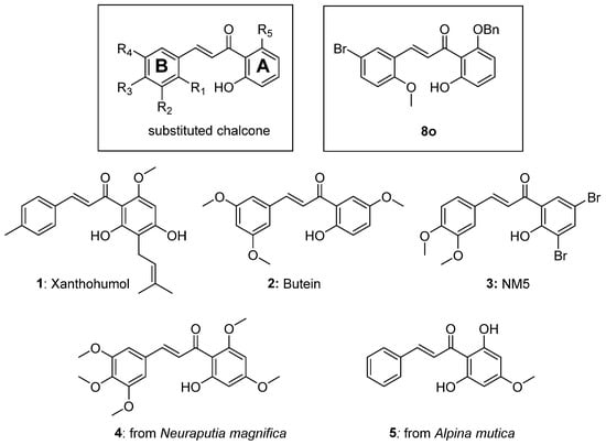 Chalcone scaffold with delineated A and B rings (left box), compound 8o (right box), bioactive chalcone structures 1–3, and related natural products 4–5. Note: Xanthohumol 1 (found in hops) and butein 2 have anti-inflammatory properties [8,9], and NM5 3 has been suggested to inhibit the mTOR pathway [6].