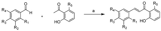 As shown in Figure 2, the chalcones were synthesized using crossed aldol condensation between a substituted benzaldehyde and a substituted acetophenone derivative in KOH in methanol (40% wt/v) at 60 °C.